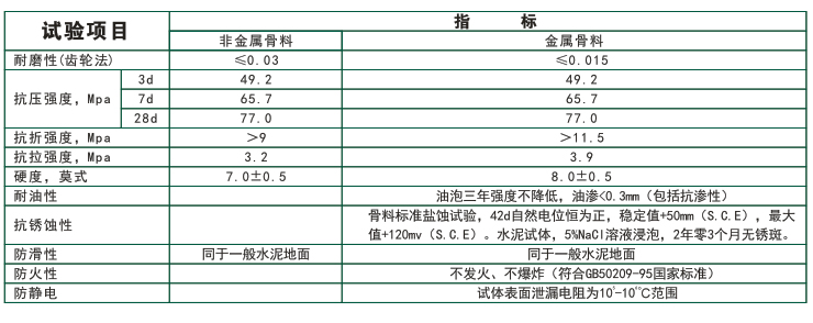 根据骨粉为金属、非金属耐磨硬化骨料,由一定颗粒级配的金属矿物骨料或极度耐磨的非铁类金属骨料以及特殊添加剂组成。骨料是根据其形状、级配和优良的物理、机械性能进行选择而成。 适用范围 大广场、超市、一般工厂、公共场所、停车场、码头、交通运输、月台、汽车维修场、重机械厂。性能特点: 1、具有很高的耐磨性; 2、减少灰尘; 3、耐冲击; 4、施工方便,易维护。 性能特点 1、密封防尘、硬化耐磨;2、抑制化学物质的侵蚀;3、永久的光泽;4、抗风化性能好;5、施工方便,过程环保;6、降低维护费用,一次施工,永久防护。 施工工艺 1、在初凝的混凝土表面均匀撒布耐磨骨料; 2、机械压平、收光; 3、伸缩缝处理; 4、养护硬化地面; 施工剖面